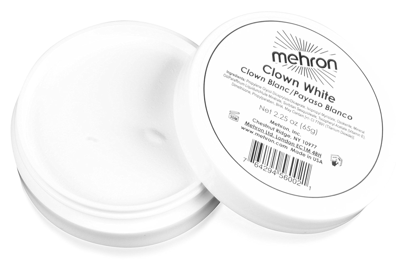 Consistency in quality and coverage are what makes Mehron’s Clown White the first choice of professional clowns and mimes. This super smooth, ultra-white cream covers efficiently without dryness or cracking, even under the most demanding performance conditions. Mehron uses a high concentration of titanium dioxide and formulates the base to a smooth, easy to work with consistency.